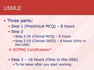 1) The USMLE exam has 3 steps - Step 1, Step 2 (with 2 parts), and Step 3. Step 1 and 2 are required to obtain ECFMG certification.