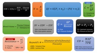 The document contains a comprehensive overview of various cardiovascular and respiratory mechanisms, including blood flow dynamics, pressures, and gas exchange principles. It discusses concepts such as cardiac output, stroke volume, and the effects of different factors on vascular resistance and compliance. Additionally, it covers renal function, hormonal influences on metabolism, and the physics behind capillary filtration and reabsorption.