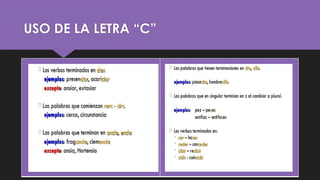 This document discusses the proper use of the letters C, S, and Z in writing. It covers how to use the letter C, how to use the letter S, and how to use the letter Z, and includes activities to practice using these letters correctly.