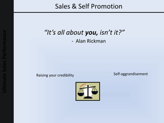 This document discusses self-promotion in sales. It argues that self-promotion can build credibility with customers by highlighting relevant qualifications, knowledge, skills, and experience. However, it should be done through suggesting solutions and adding value for the customer rather than boasting. Effective self-promotion involves positioning oneself as a helpful partner focused on understanding customer needs rather than personal gain. The document provides examples of both appropriate and inappropriate statements for self-promotion and emphasizes qualities like listening, humility and respect.