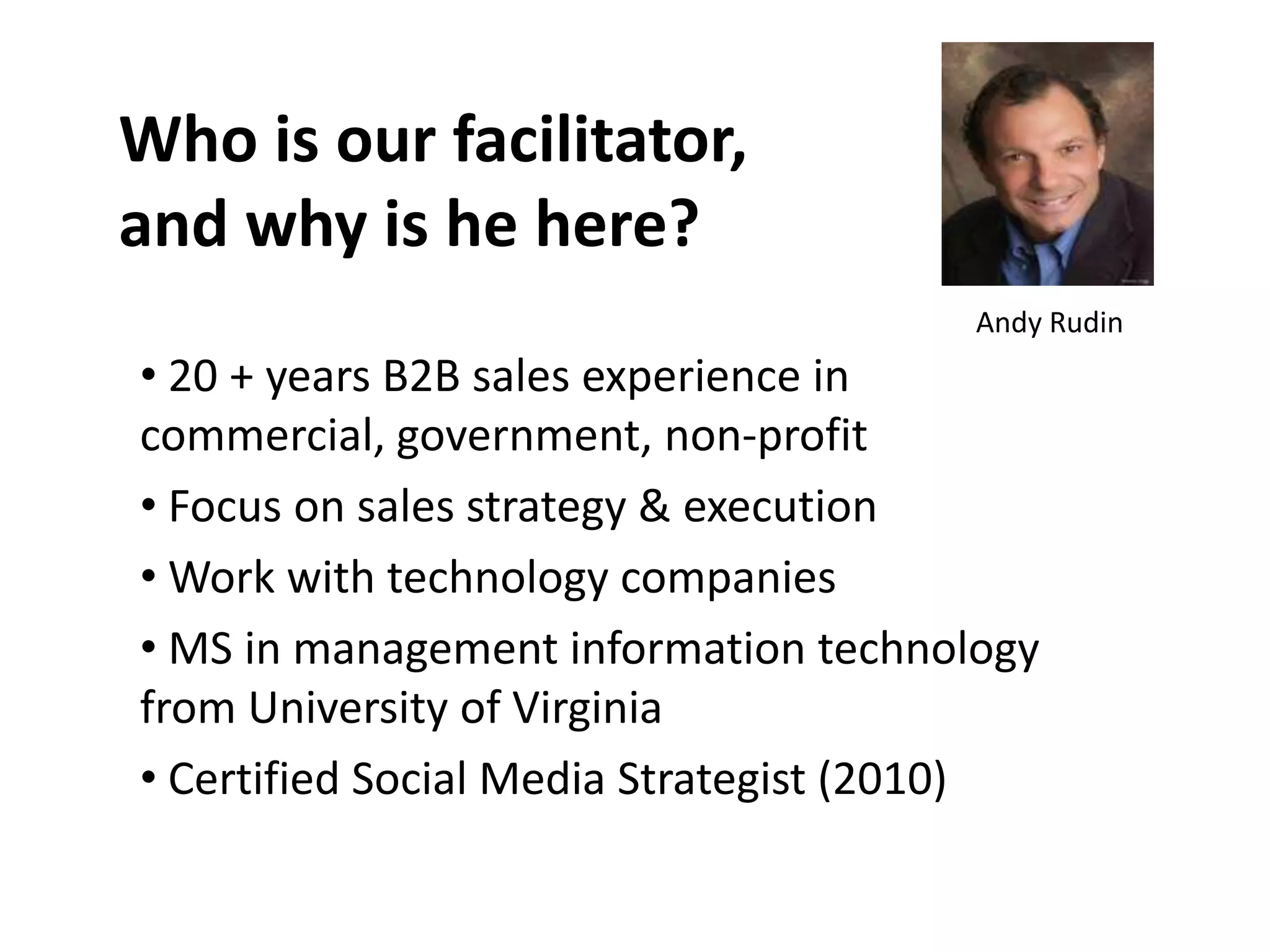 The document provides an agenda and overview for a workshop on planning customer conversations, covering topics such as distinguishing knowns from unknowns, assessing risks, asking qualifying questions, defining problems through discovery, and best practices for sales conversations and follow up. The facilitator, Andy Rudin, has over 20 years of B2B sales experience and will share frameworks and recommendations to help participants advance their business goals through customer engagement.