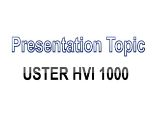 This document provides information about the USTER HVI 1000, a high-volume instrument used to measure important cotton fiber properties. It measures 10 properties including micronaire, maturity index, short fiber index, fiber strength, elongation, moisture content, color, trash percentage and grade, and spinning consistency index. There are five global companies that manufacture these types of rapid testing machines, including USTER Technologies. The USTER HVI 1000 uses a computer system, balance, printer, and optional barcode reader or UV/NEP modules. It measures properties through airflow resistance, optical length measurement, and clamp strength testing. The results are operator independent, based on large samples, provided quickly in summarized reports.