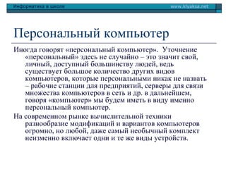 Документ посвящен основным компонентам персонального компьютера, включая системный блок, монитор, клавиатуру и мышь. Также описываются периферийные устройства, такие как принтеры, сканеры и модемы, и их функции. Упоминается использование веб-камер для видеоконференций в условиях интернет-сетей.