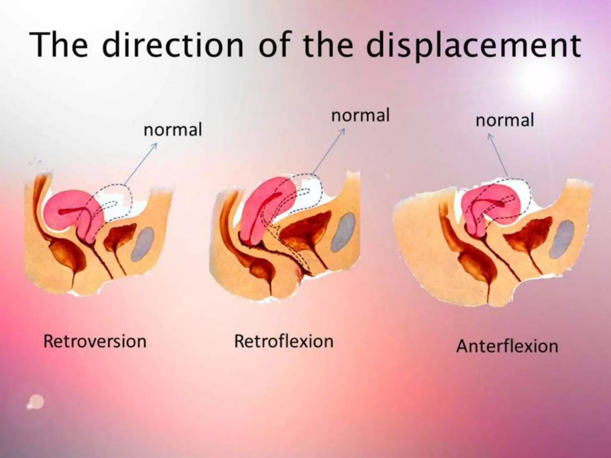 Uterine displacement occurs when the uterus is moved from its normal position, either backward (retroverted uterus) or downward (uterine prolapse). Common causes include repeated pregnancies close together, heavy lifting after childbirth, certain sports/dances, vaginal tears during delivery, constipation, bladder issues, tumors, or pelvic injuries. Symptoms of a retroverted uterus include back pain, painful periods, constipation, frequent urination, and miscarriages. Diagnosis involves a pelvic exam and imaging tests. Treatment options are nonsurgical like pessaries and exercises or surgical like hysterectomy or uterine suspension.