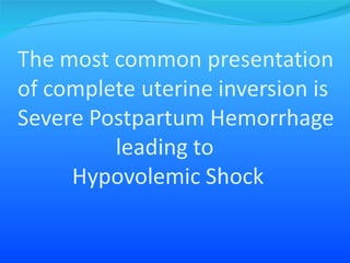 Uterine inversion is a life-threatening obstetric emergency that requires immediate treatment to prevent hemorrhagic shock and death. The diagnosis is based on clinical findings of bleeding and palpation of the inverted uterus. The first steps in treatment are to stop oxytocin, establish IVs, and manually replace the inverted uterus. If manual replacement fails, intravenous nitroglycerin can be used to relax the uterus and allow replacement, with doses up to 1000 micrograms. Surgery may be required if inversion persists after attempts at uterine relaxation and manual replacement.