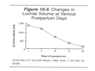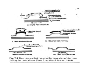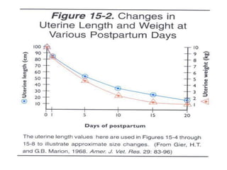 Uterine involution in cattle involves four main processes: [1] shrinkage of the genital tract through myometrial contractions over the first 15 days postpartum, [2] restoration of the endometrium through necrosis, sloughing and repair over the first 15 days, [3] resumption of normal ovarian function beginning around day 7-14 with the first follicular wave, and [4] elimination of bacterial contamination which normally clears by 6-8 weeks postpartum through phagocytosis. The document discusses the hormonal and cellular changes involved in each of these processes to return the reproductive tract to a non-pregnant state after calving.