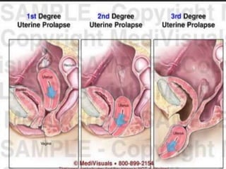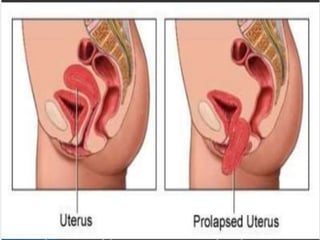 Uterine prolapse occurs when the uterus descends from its normal position due to weakened pelvic muscles and tissues. It is often caused by pregnancy, childbirth, obesity, menopause, or chronic conditions like coughing or constipation. Symptoms range from a feeling of heaviness to organs protruding from the vagina. Treatment options include pelvic floor exercises, pessaries, hormone therapy, and surgery to repair damaged tissues or remove the uterus. Surgical risks include infection, incontinence, and prolapse recurrence.