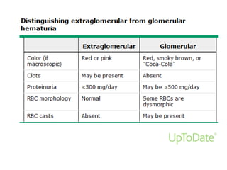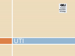 This document discusses urinary tract infections (UTIs) and hematuria. It covers topics such as the different levels of UTIs, grading severity, risk factors, definitions of uncomplicated and complicated UTIs, etiology, diagnosis and treatment of acute cystitis and pyelonephritis. It also discusses recurrent UTIs, UTIs during pregnancy, in postmenopausal women, and complicated cases involving diabetes, HIV, renal transplants and chronic kidney disease. The document provides detailed guidelines on diagnosis, treatment, antibiotic selection and follow up for the various types of UTIs and patient populations.