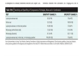 Urinary tract infections are common in children and can cause acute and chronic health issues if not properly treated. The urinary tract is normally sterile, but bacteria can cause infections when they adhere to the mucosa and evade clearance from the urinary flow. Common symptoms include abdominal pain, fever, vomiting, and dysuria. Escherichia coli is the most frequent cause of UTIs in children. Risk factors, diagnostic testing, and treatment depend on whether the infection involves the bladder (cystitis) or kidneys (pyelonephritis). Treatment involves antibiotics chosen based on the suspected bacteria and ranges from 3-14 days depending on the infection severity and location.