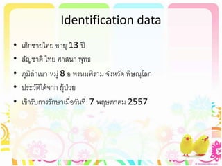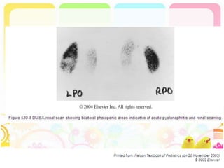 This case discusses a 13-year-old Thai boy presenting with right flank pain and urinary tract infection symptoms for 1 day. Physical examination found costovertebral angle tenderness on the right side. Investigations including urine analysis, urine culture and ultrasound were performed. He was diagnosed with acute urinary tract infection and treated with intravenous antibiotics. Follow up showed resolution of symptoms and no growth on repeat urine culture. Management included treatment of the acute infection and plans for prevention of recurrence through antibiotic prophylaxis and radiological investigation given his risk factors.