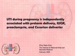 This document provides guidelines for urinary tract infections (UTIs) during pregnancy. It discusses that UTIs are the most common medical complications of pregnancy and are associated with risks like preterm delivery. It outlines recommendations for screening, diagnosing, and treating asymptomatic bacteriuria, acute cystitis, and acute pyelonephritis during pregnancy. Treatment is recommended for asymptomatic bacteriuria to reduce risks, and symptomatic UTIs should be promptly treated with appropriate antibiotics based on culture and sensitivity testing. Post-treatment cultures are advised to confirm resolution of infections.