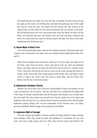 This document summarizes various creation myths from around the world that involve the sacrifice of a primordial being or the emergence of life from a cosmic egg. It discusses myths involving giants like Purusha, Pan Gu, Ymir, and Tiamat being sacrificed or dying and the creation of the world from their bodies. It also covers myths where the world emerges from a cosmic egg, referencing Judeo-Christian, Hindu, Chinese, and Greek stories. The document then explains how these myths can be interpreted through the lens of the new creation theory in Unification Thought as representing the original human beings that God planned all other beings and things upon.