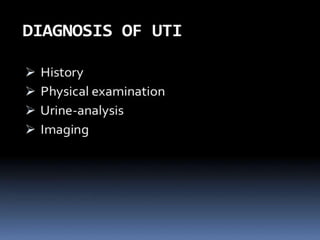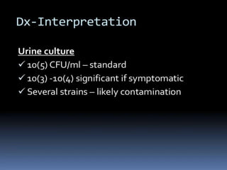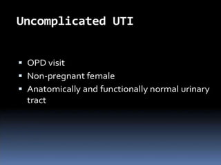 The document discusses urinary tract infections (UTIs). It defines different types of UTIs including asymptomatic bacteriuria, cystitis, prostatitis, and pyelonephritis. Escherichia coli is the most common bacteria responsible. Diagnosis requires a urine culture showing over 105 colony-forming units per mL or symptoms present with a lower count. Treatment duration depends on the infection location, with tissue infections requiring longer therapy. Risk factors include anatomical abnormalities, foreign bodies, and loss of host defenses.