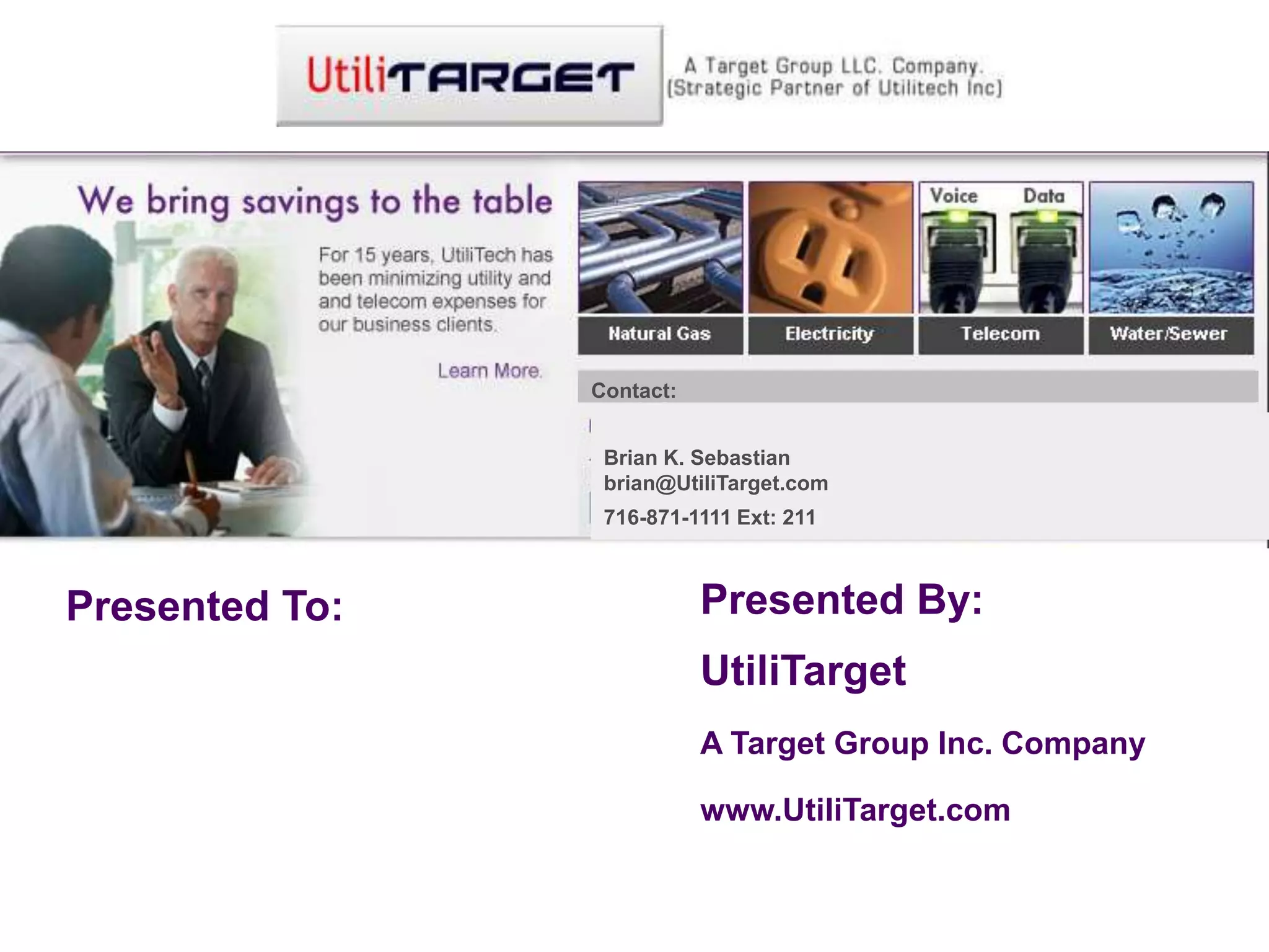 The document is a presentation from UtiliTarget, an independent utility and telecommunications cost analysis company. UtiliTarget offers complete analysis of utility and telecom bills to identify overcharges and contract compliance issues. Their services are contingency-based, with no fee charged unless cost savings are identified. They have expertise in analyzing various industry sectors including healthcare, manufacturing, education, and government.