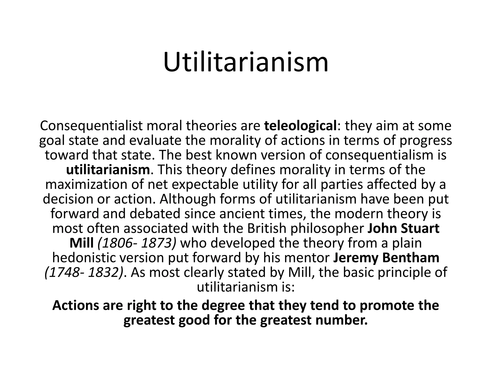 1. Utilitarianism is a consequentialist moral theory that defines morality in terms of maximizing utility, or happiness, for all affected parties. It was most influentially developed by Jeremy Bentham and John Stuart Mill.