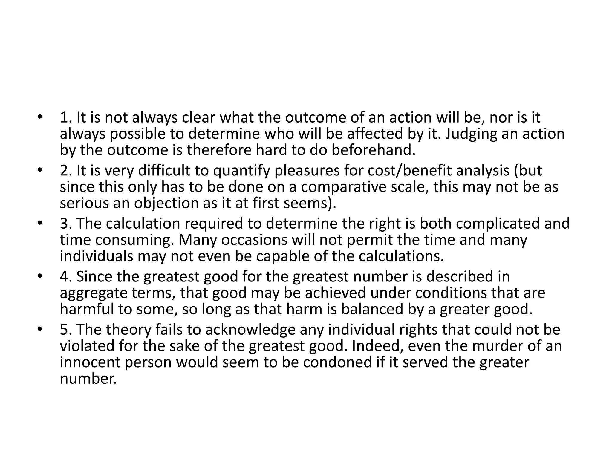 2. The basic principle of utilitarianism is that actions are right to the degree that they promote the greatest good for the greatest number. However, there are objections to determining the consequences of actions and making the necessary calculations to apply the theory.