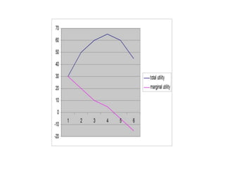 Utility is defined as the satisfaction or benefit derived from consuming goods and services. It can be measured in two ways: cardinal utility which assigns numerical values to satisfaction, and ordinal utility which ranks preferences without numbers. There are two types of utility: total utility which is the sum of utility from consuming multiple units of a good, and marginal utility which is the change in total utility from consuming one additional unit. As consumption of a good increases, marginal utility initially increases but then decreases, following the law of diminishing marginal utility. This is illustrated through an example showing total and marginal utility declining for additional ice cream consumption.
