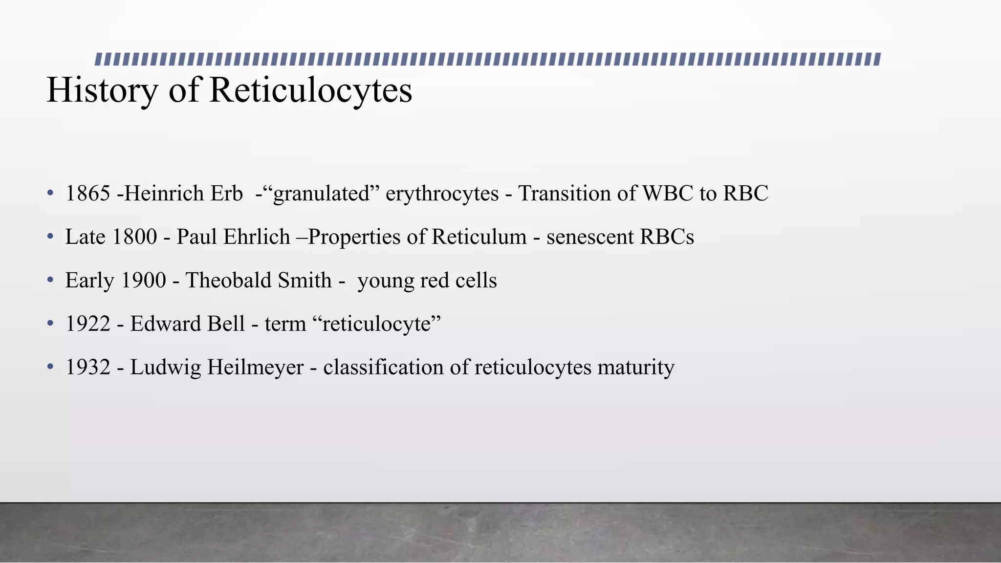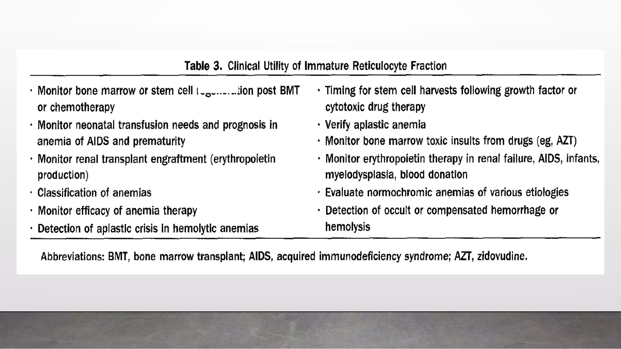 Reticulocytes are immature red blood cells that are released from the bone marrow into circulation during erythropoiesis. Automated analysis of reticulocytes provides several parameters that can help evaluate bone marrow function and iron status. The immature reticulocyte fraction is useful for monitoring bone marrow recovery after chemotherapy or transplant. Reticulocyte hemoglobin content measures like CHr can detect iron deficiency earlier than other tests. Using multiple reticulocyte parameters in diagnostic algorithms helps classify anemias and guide treatment.