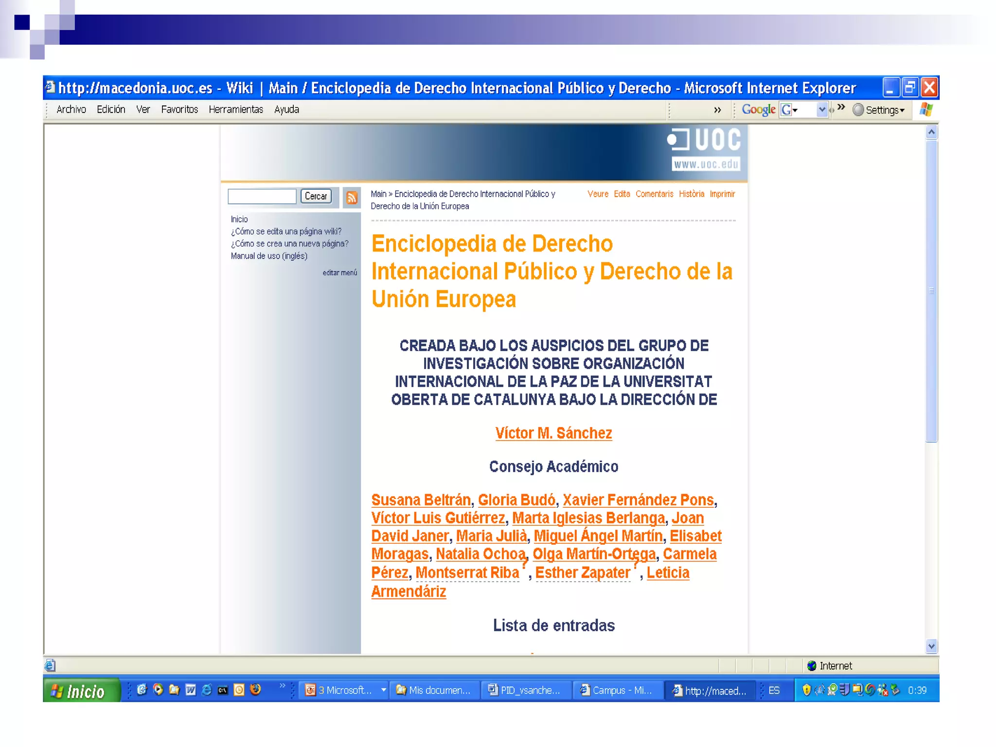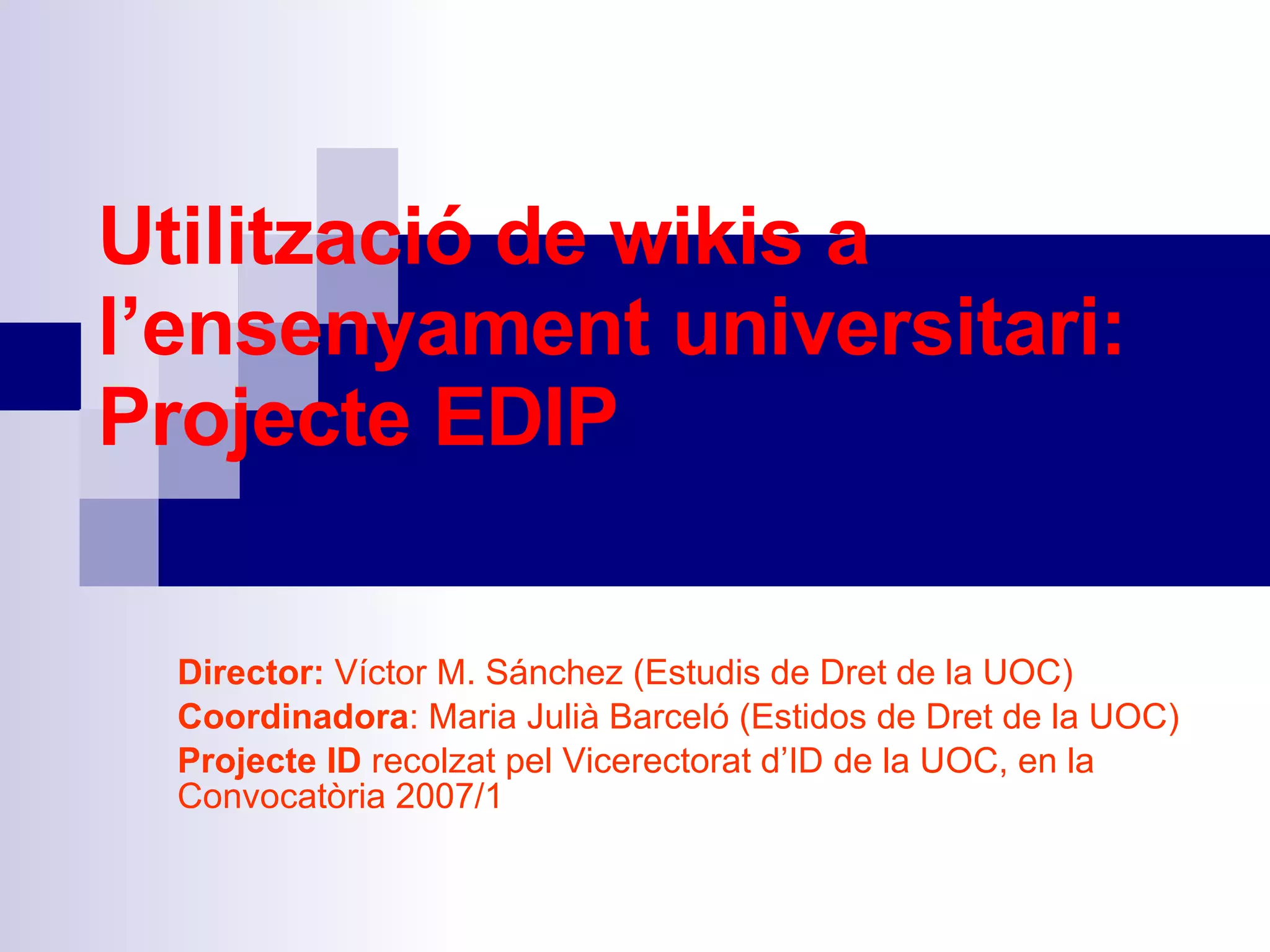 Utilització de wikisa l’ensenyament universitari: Projecte EDIP Director: Víctor M. Sánchez (Estudis de Dret de la UOC) Coordinadora : Maria Julià Barceló (Estidos de Dret de la UOC) Projecte ID recolzat pel Vicerectorat d’ID de la UOC, en la Convocatòria 2007/1