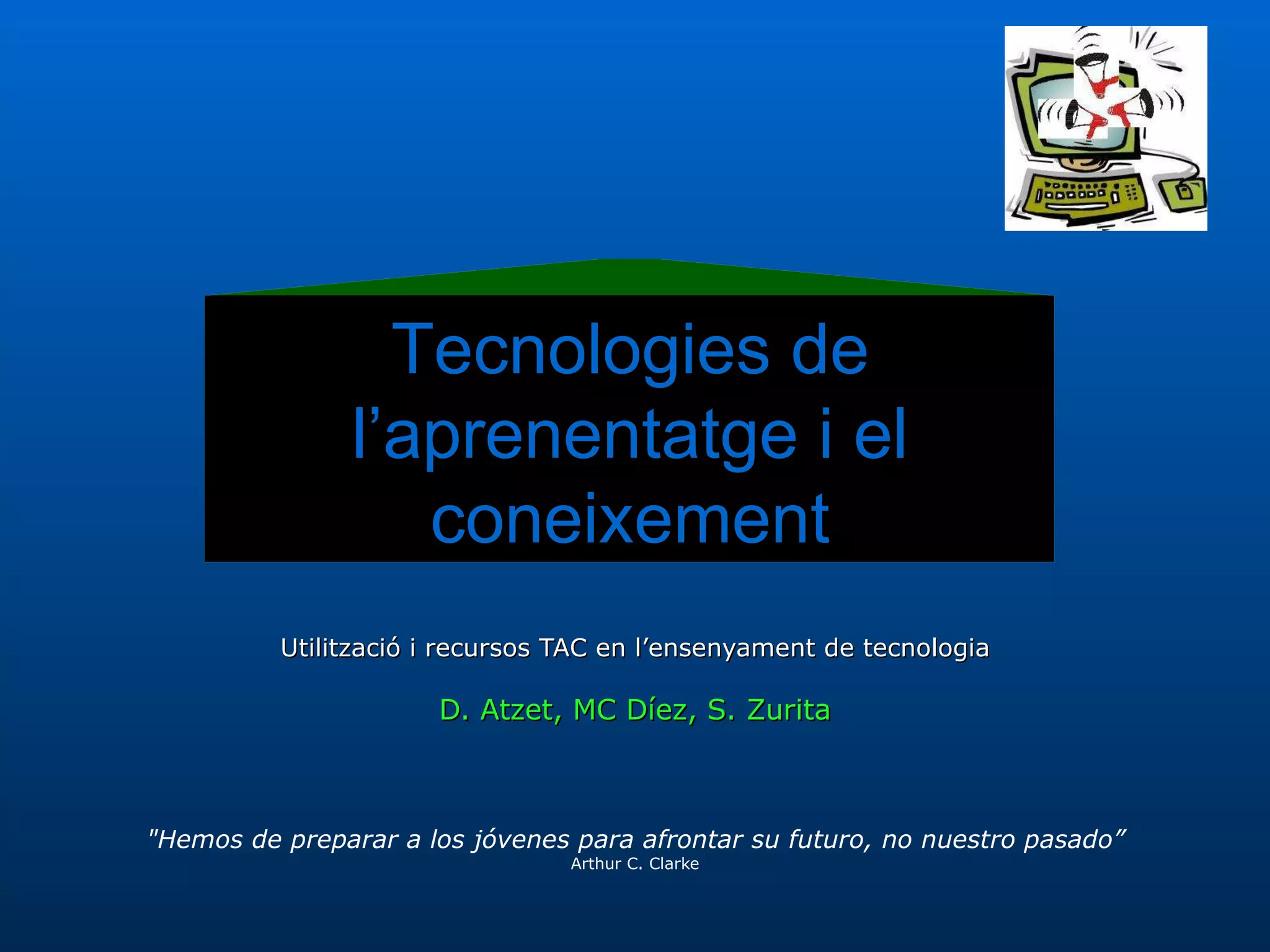 Utilització i recursosTAC en l’ensenyament de tecnologia D. Atzet, MC Díez, S. Zurita "Hemos de preparar a los jóvenes para afrontar su futuro, no nuestro pasado” Arthur C. Clarke Tecnologies de l’aprenentatge i el coneixement