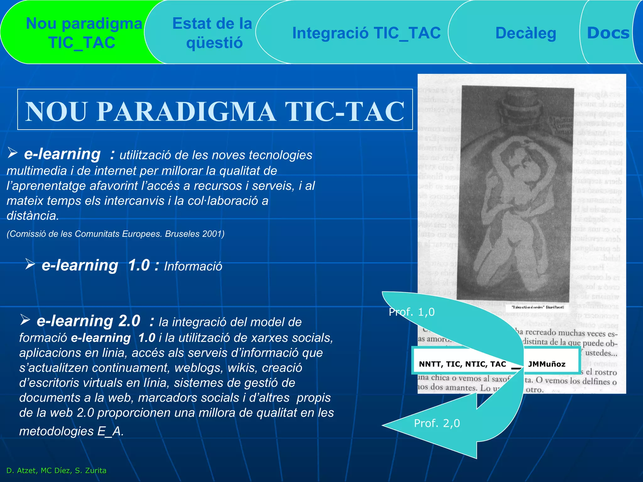 Nou paradigma TIC_TAC Estat de la qüestió Integració TIC_TAC Decàleg Docs NOU PARADIGMA TIC-TAC e-learning : utilització de les noves tecnologies multimedia i de internet per millorar la qualitat de l’aprenentatge afavorint l’accés a recursos i serveis, i al mateix temps els intercanvis i la col·laboració a distància. (Comissió de les Comunitats Europees. Bruseles 2001) e-learning 1.0 : Informació e-learning 2.0 : la integració del model de formació e-learning 1.0 i la utilització de xarxes socials, aplicacions en linia, accés als serveis d’informació que s’actualitzen continuament, weblogs, wikis, creació d’escritoris virtuals en línia, sistemes de gestió de documents a la web, marcadors socials i d’altres propis de la web 2.0 proporcionen una millora de qualitat en les metodologies E_A. NNTT, TIC, NTIC, TAC _ JMMuñoz Prof. 2,0 Prof. 1,0 D. Atzet, MC Díez, S. Zurita