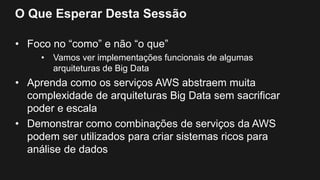 O documento discute como utilizar o DynamoDB da AWS para arquiteturas de big data, focando em implementações práticas com exemplos. Ele aborda as características de big data, casos de uso e demonstra como combinar serviços AWS, como Lambda e Redshift, para processar e analisar grandes volumes de dados. A versatilidade do DynamoDB é destacada como essencial em diversas soluções de big data, facilitando a construção de sistemas escaláveis e eficientes.