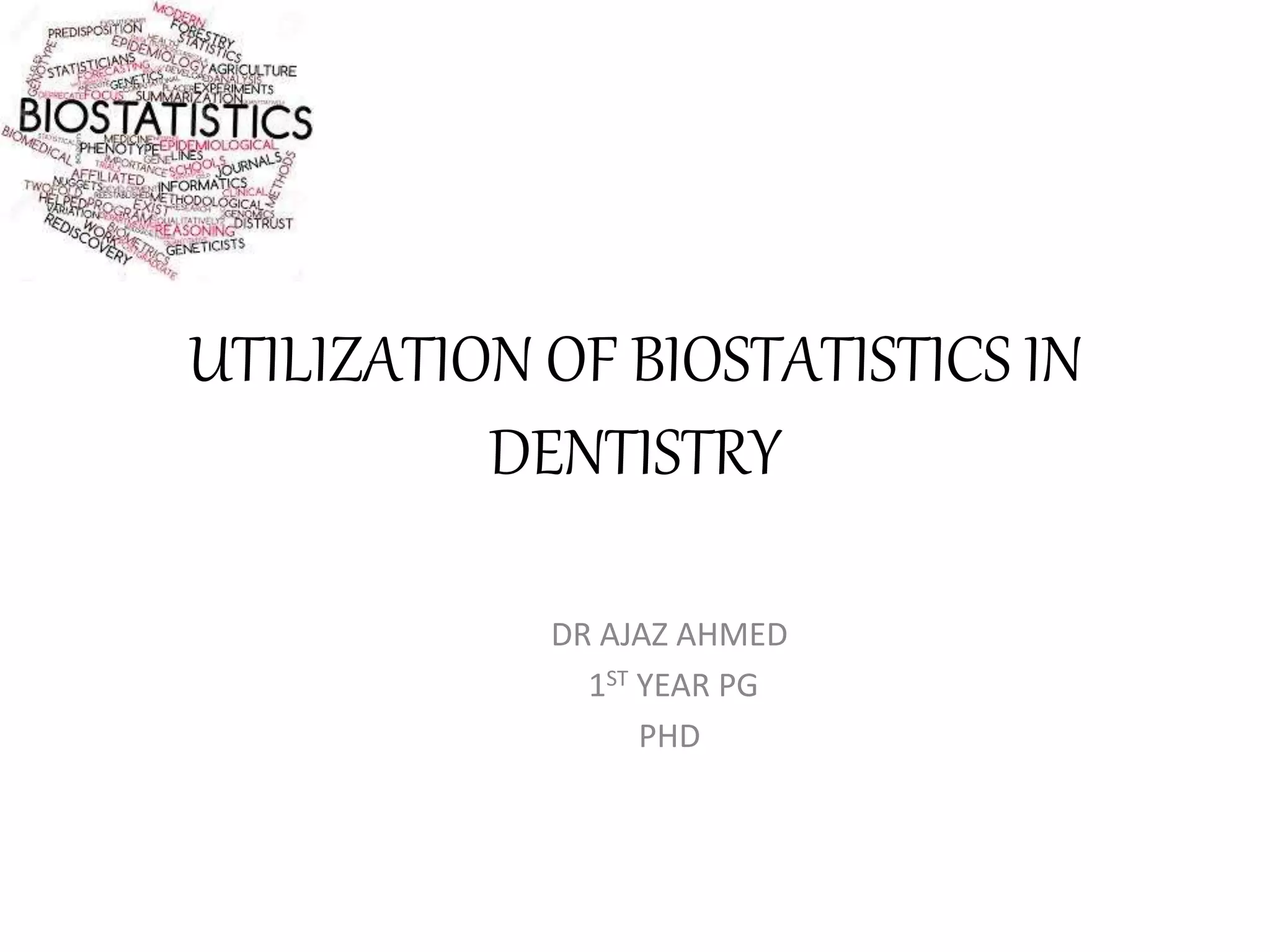 This document discusses the utilization of biostatistics in dentistry. It begins by defining biostatistics as the application of statistical processes and methods to the collection, analysis, and interpretation of biological and medical data. It then discusses the history and branches of biostatistics. The document outlines many applications of biostatistics in fields like public health dentistry, various dental specialties, medicine, pharmacology, epidemiology, biotechnology, genetics, and nutrition. It also discusses how biostatistics is used in evidence-based dentistry, research study design, and evaluating health programs. Overall, the document provides an overview of how biostatistics is widely utilized across many areas of health research and practice.