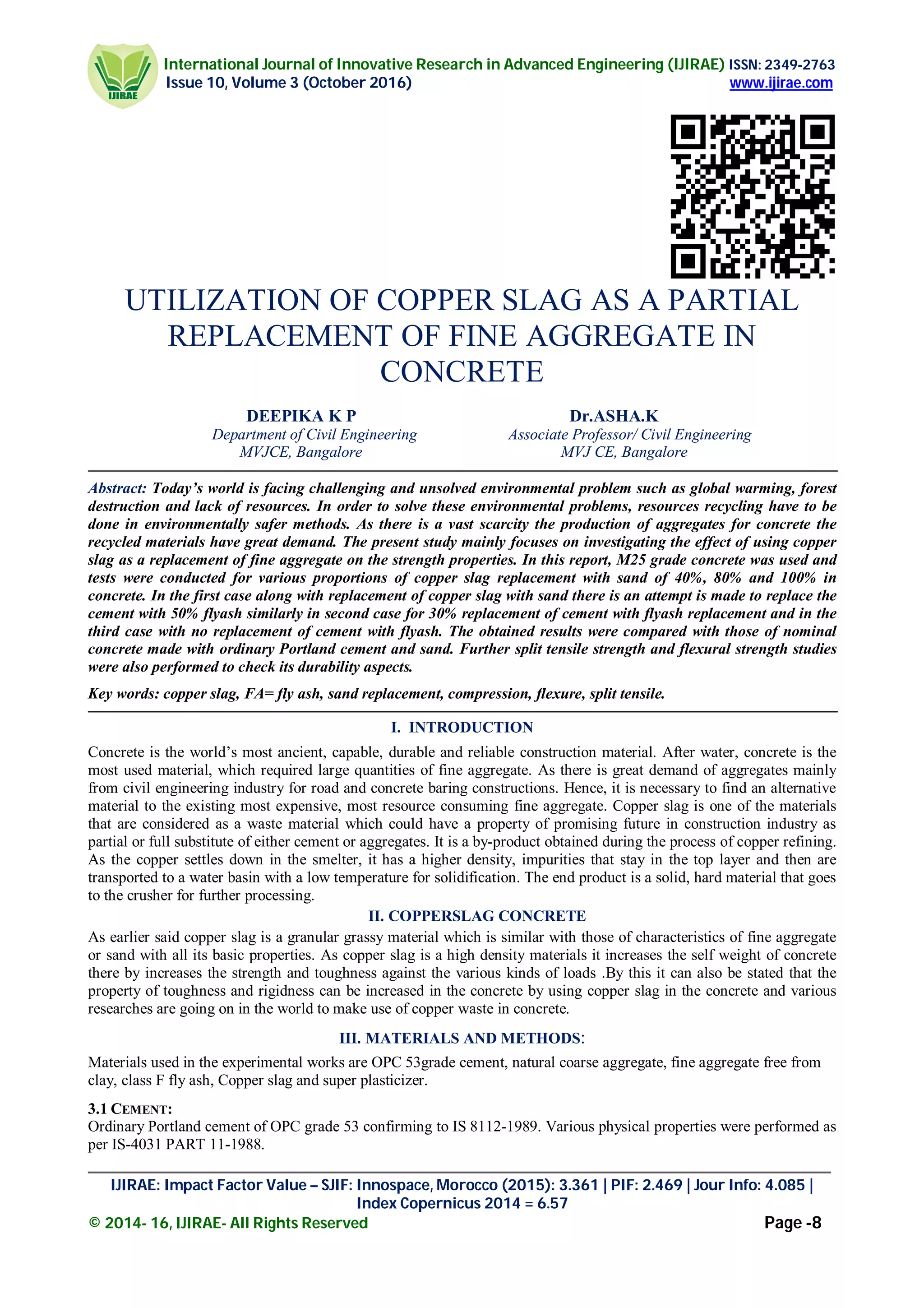 The document investigates the utilization of copper slag as a partial replacement for fine aggregate in concrete, addressing environmental issues related to resource scarcity and waste recycling. The study uses M25 grade concrete, examining the compressive, split tensile, and flexural strengths with varying proportions of copper slag and fly ash. Results indicate that replacing up to 80% of fine aggregate with copper slag can enhance strength properties significantly, making it a viable alternative in construction applications.
