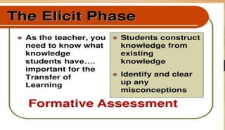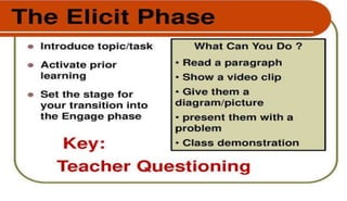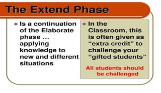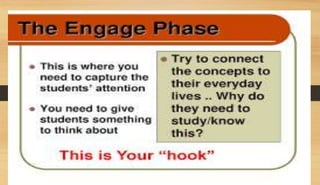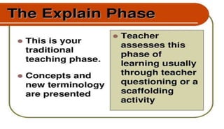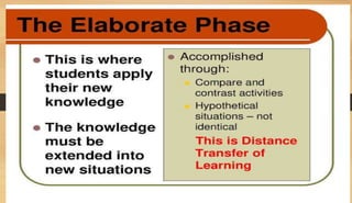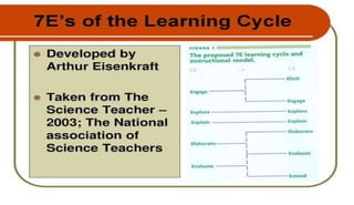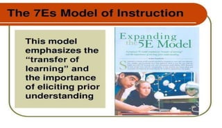 The document discusses the importance of utilizing the 7E model in science instruction. It begins by explaining constructivism and how the 7E model is based on this approach. It then outlines the objectives of the 7E model as establishing knowledge on instruction methodology, connecting information, and developing problem-solving skills through experiential learning. The 7E model consists of seven stages: elicit, engage, explore, explain, elaborate, evaluate, and extend. Each stage is described in detail. Finally, it notes that the 7E model was expanded from the 5E model to place greater emphasis on prior knowledge and ensure crucial learning elements are not omitted.