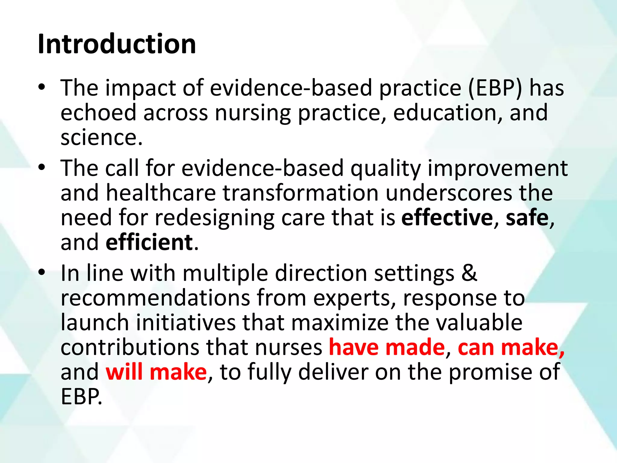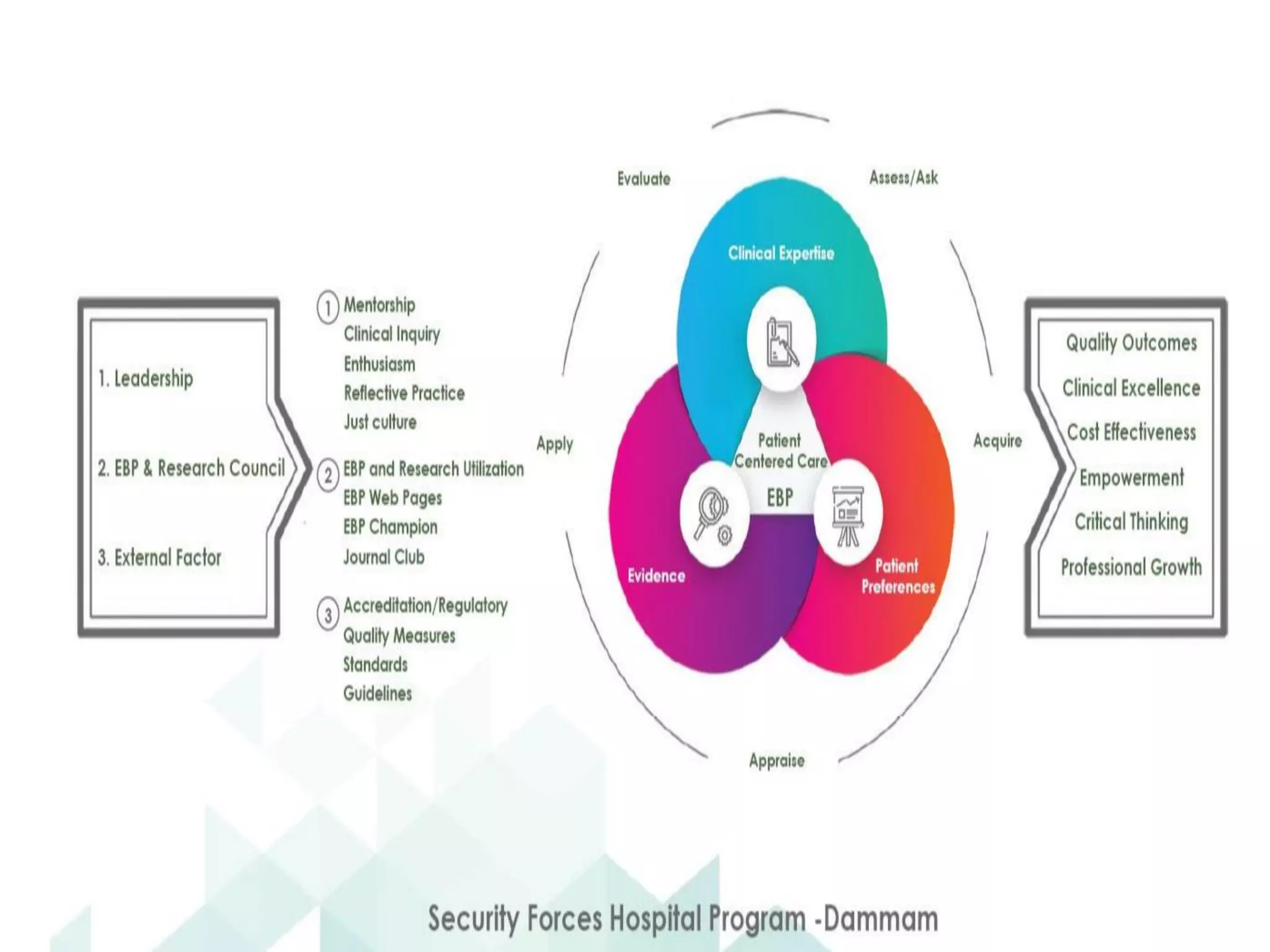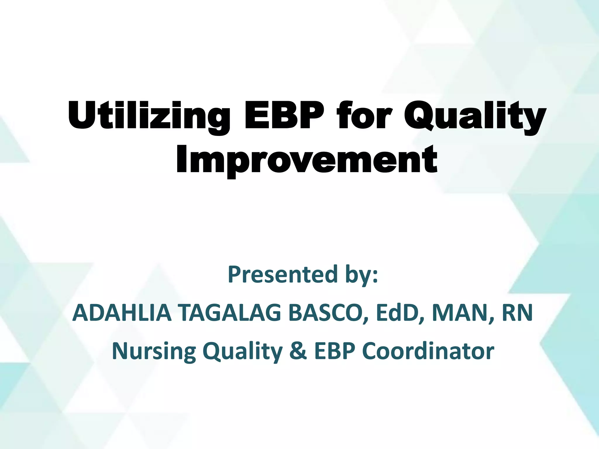 This document discusses utilizing evidence-based practice (EBP) for quality improvement in healthcare. It states that EBP and quality improvement are complementary, with EBP justifying clinical decisions and quality improvement implementing evidence into practice. The document identifies some misconceptions around EBP and suggests ways to address them, such as developing the right organizational culture that embraces EBP, providing education to nurses on EBP, employing models/frameworks, and taking an interprofessional approach. It emphasizes that EBP should be a pillar across all healthcare settings to help standardize practices and reduce variation in care outcomes.