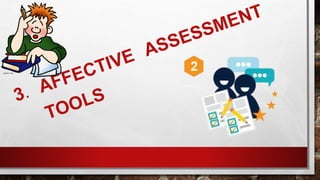 The document discusses different methods for assessing affect and attitudes. It describes checklists, rating scales, and Likert scales. Checklists involve observing specific skills or behaviors and indicating whether they are not yet, sometimes, or frequently demonstrated. Rating scales translate judgments into numbers or descriptions to provide feedback. Likert scales involve agreeing or disagreeing with statements to assess attitudes. Key steps in constructing these assessment methods are aligning criteria with outcomes, avoiding errors like leniency or bias, and writing clear statements for scales.