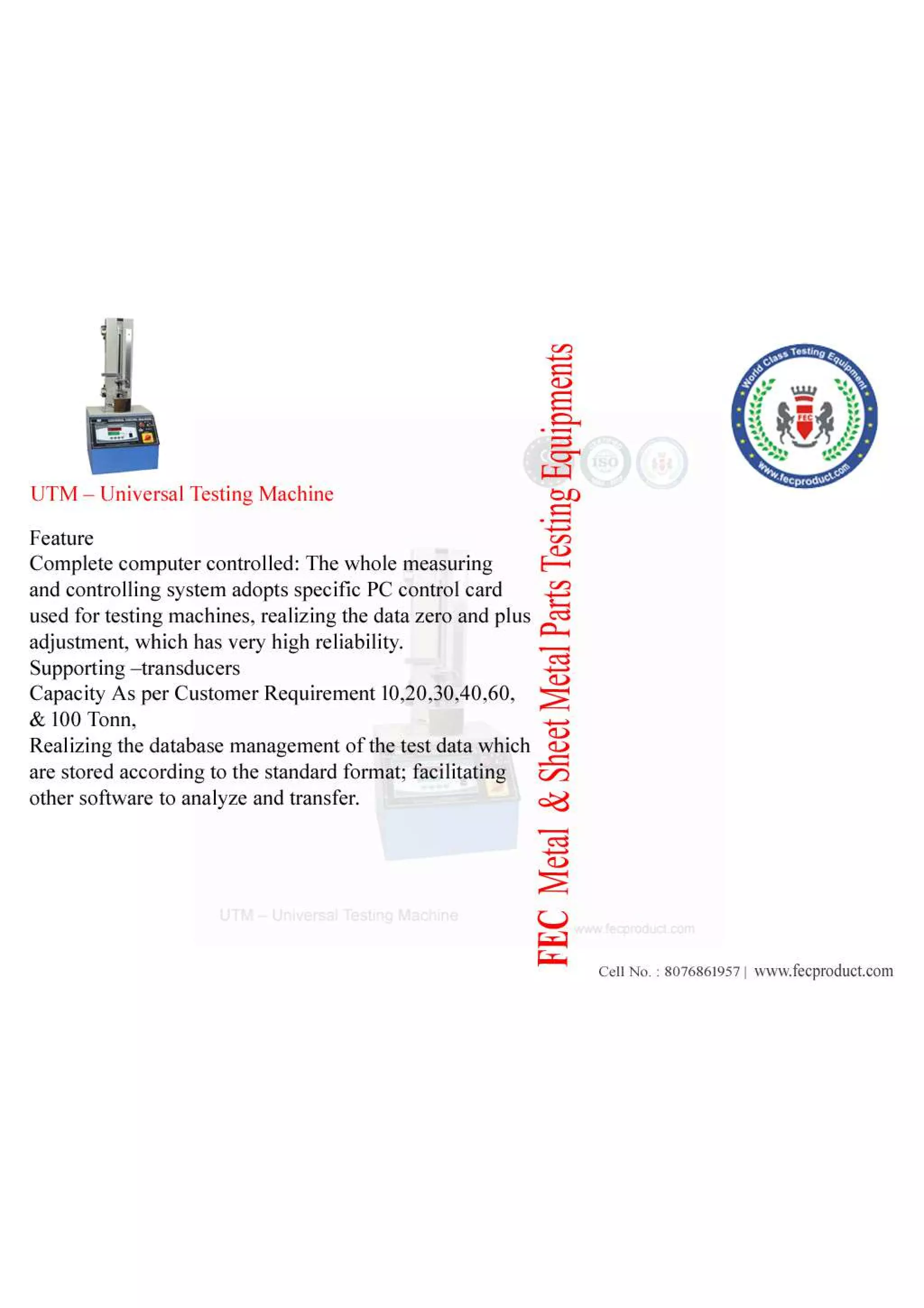 Complete computer controlled: The whole measuring and controlling system adopts specific PC control card used for testing machines, realizing the data zero and plus adjustment, which has very high reliability. Supporting –transducers Capacity As per Customer Requirement 10,20,30,40,60, & 100 Tonn, Realizing the database management of the test data which are stored according to the standard format; facilitating other software to analyze and transfer. Perfect programming by auto program control, every control mode can smoothly shift to another one. Fulfilling the test requirement of all kinds of materials with every test standard home and abroad. Control software has the auto-adjusting function of test hardness, which assures that the system works with every kind of specimen hardness. Perfect graphic function realizing the arbitrarily magnifying, decreasing, equaling, adding, indicative display and print of all kinds of test curves, the test point searching as well as the simultaneous display and print of several kinds of test curves. Data processing supposes self-disposing and input disposing of graphic human computer interaction, which facilitates the check and contrast of the test result. The user can self -define the output of the test report, which makes the report format have very high flexibility. Modularization design facilitates the software upgrading, function spreading as well as the development. All the crucial parts were processed by our own processing center