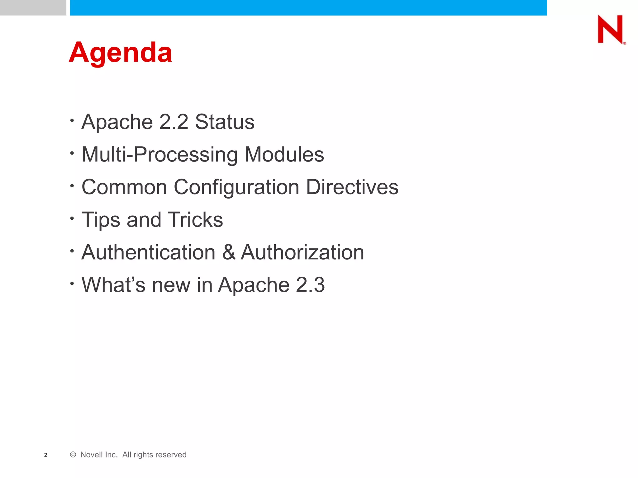 This document provides an overview and summary of Apache 2.2 configuration including: