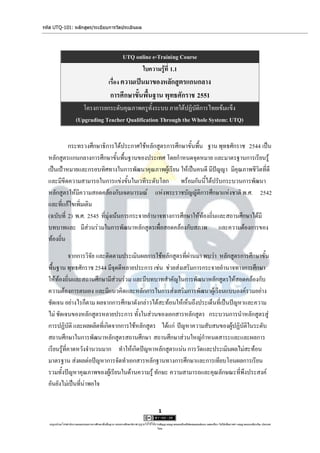 UTQ online e-Training Course ใบความรู้ที่ 1.1 เรื่อง ความเป็นมาของหลักสูตรแกนกลาง การศึกษาขั้นพื้นฐาน พุทธศักราช 2551 โครงการยกระดับคุณภาพครูทั้งระบบ ภายใต้ปฏิบัติการไทยเข้มแข็ง (Upgrading Teacher Qualification Through the Whole System: UTQ) กระทรวงศึกษาธิการได้ประกาศใช้หลักสูตรการศึกษาขั้นพื้น ฐาน พุทธศักราช 2544 เป็น หลักสูตรแกนกลางการศึกษาขั้นพื้นฐานของประเทศ โดยกาหนดจุดหมาย และมาตรฐานการเรียนรู้ เป็นเป้าหมายและกรอบทิศทางในการพัฒนาคุณภาพผู้เรียน ให้เป็นคนดี มีปัญญา มีคุณภาพชีวิตที่ดี และมีขีดความสามารถในการแข่งขั้นในเวทีระดับโลก พร้อมกันนี้ได้ปรับกระบวนการพัฒนา หลักสูตรให้มีความสอดคล้องกับเจตนารมณ์ แห่งพระราชบัญญัติการศึกษาแห่งชาติ พ.ศ. 2542 และที่แก้ไขเพิ่มเติม (ฉบับที่ 2) พ.ศ. 2545 ที่มุ่งเน้นการกระจายอานาจทางการศึกษาให้ท้องถิ่นและสถานศึกษาได้มี บทบาทและ มีส่วนร่วมในการพัฒนาหลักสูตรเพื่อสอดคล้องกับสภาพ และความต้องการของ ท้องถิ่น จากการวิจัย และติดตามประเมินผลการใช้หลักสูตรที่ผ่านมา พบว่า หลักสูตรการศึกษาขั้น พื้นฐาน พุทธศักราช 2544 มีจุดดีหลายประการ เช่น ช่วยส่งเสริมการกระจายอานาจทางการศึกษา ให้ท้องถิ่นและสถานศึกษามีส่วนร่วม และมีบทบาทสาคัญในการพัฒนาหลักสูตรให้สอดคล้องกับ ความต้องการตนเอง และมีแนวคิดและหลักการในการส่งเสริมการพัฒนาผู้เรียนแบบองค์รวมอย่าง ชัดเจน อย่างไรก็ตาม ผลจากการศึกษาดังกล่าวได้สะท้อนให้เห็นถึงประเด็นที่เป็นปัญหาและความ ไม่ ชัดเจนของหลักสูตรหลายประการ ทั้งในส่วนของเอกสารหลักสูตร กระบวนการนาหลักสูตรสู่ การปฏิบัติ และผลผลิตที่เกิดจากการใช้หลักสูตร ได้แก่ ปัญหาความสับสนของผู้ปฏิบัติในระดับ สถานศึกษาในการพัฒนาหลักสูตรสถานศึกษา สถานศึกษาส่วนใหญ่กาหนดสาระและและผลการ เรียนรู้ที่คาดหวังจานวนมาก ทาให้เกิดปัญหาหลักสูตรแน่น การวัดและประเมินผลไม่สะท้อน มาตรฐาน ส่งผลต่อปัญหาการจัดทาเอกสารหลักฐานทางการศึกษาและการเทียบโอนผลการเรียน รวมทั้งปัญหาคุณภาพของผู้เรียนในด้านความรู้ ทักษะ ความสามารถและคุณลักษณะที่พึงประสงค์ อันยังไม่เป็นที่น่าพอใจ 1 utqonlineโดยสานักงานคณะกรรมการการศึกษาขั้นพื้นฐาน กระทรวงศึกษาธิการ ญาตให้ใช้ได้ตามสัญญาอนุญาตของครีเอทีฟคอมมอนส์แบบ แสดงที่มา-ไม่ใช้เพื่อการค้า-อนุญาตแบบเดียวกัน ประเทศ อนุ 3.0 ไทย.