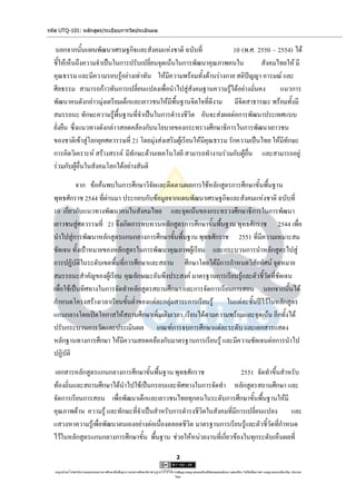 คาดหวังในการพัฒนาผู้เรียน ที่ชัดเจนตลอดแนว ซึ่งสามารถช่วยให้หน่วยงานที่เกี่ยวข้องในระดับ ท้องถิ่นและสถานศึกษาร่วมกัน พัฒนาหลักสูตรได้อย่างมั่นใจ ทาให้การจัดทาหลักสูตรในระดับ สถานศึกษามีคุณภาพและมีความเป็นเอกภาพยิ่งขึ้น อีกทั้งยังช่วยให้เกิดความชัดเจนเรื่องการวัดและ ประเมินผลการเรียนรู้ และช่วยแก้ปัญหาการเทียบโอนระหว่างสถานศึกษา ดังนั้นในการพัฒนา หลักสูตรทุกระดับตั้งแต่ระดับชาติจนกระทั่งถึงสถานศึกษา จะต้องสะท้อนคุณภาพตามมาตรฐาน การเรียนรู้และตัวชี้วัดที่กาหนดไว้ในหลักสูตร แกนกลางการศึกษาขั้นพื้นฐาน หลักสูตรแกนกลางฯ เป็นกรอบทิศทางในการจัดการศึกษาทุกรูปแบบ และครอบคลุมผู้เรียนทุกกลุ่มเป้าหมายในระดับ การศึกษาขั้นพื้นฐาน อย่างไรก็ตาม การจัดการศึกษาให้ประสบความสาเร็จตามเจตนารมณ์ของหลักสูตร การศึกษาขั้นพื้น ฐาน ทุกฝ่ายที่เกี่ยวข้องทั้งระดับชาติ ชุมชน ครอบครัว และบุคคลต้องร่วม รับผิดชอบ โดยร่วมกันทางานอย่างเป็นระบบและต่อเนื่อง ในการวางแผน ดาเนินการ ส่งเสริม สนับสนุน ตรวจสอบ ตลอดจนปรับปรุงแก้ไข เพื่อพัฒนาเยาวชนชาติไปสู่คุณภาพตามมาตรฐาน การเรียนรู้ที่กาหนดไว้ หลักสูตรแกนกลางการศึกษาขั้นพื้นฐาน พุทธศักราช 2551 กับแนวคิดหลักสูตรอิงมาตรฐาน หลักสูตรแกนกลางการศึกษาขั้นพื้นฐาน พุทธศักราช 2551 ยึดหลักการและแนวคิด สาคัญคือ มีมาตรฐานการเรียนรู้ เป็นเป้าหมายในการพัฒนาผู้เรีย น (Standards-based curriculum) โดยสานักงานคณะกรรมการการศึกษาขั้นพื้นฐานมีบทบาทหน้าที่ในการกาหนด มาตรฐานการเรียนรู้ขึ้น มาตรฐานการเรียนรู้มีความสาคัญสาหรับทุกฝ่ายที่เกี่ยวข้อง ผู้เรียน - มาตรฐานการเรียนรู้ช่วยให้ผู้เรียนทราบถึงสิ่งที่ตนต้องรู้และปฏิบัติได้ รวมทั้ง คุณลักษณะ สาคัญซึ่งเป็นสิ่งท้าทาย กระตุ้นให้ผู้เรียนมีความพยายามที่จะ ก้าวไปให้ถึงจุดนั้น ผู้สอน - มาตรฐานการเรียนรู้เป็นกรอบและแนวทางในการสร้างหลักสูตร ออกแบบการ เรียนการสอน และการประเมินผล ทาให้ทราบว่าอะไรเป็นสิ่งสาคัญที่นักเรียน ควรจะรู้ และปฎิบัติได้ ชุมชน ท้องถิ่น และระดับชาติ-- มาตรฐานการเรียนรู้เป็นความคาดหวังทางการศึกษาที่ตั้ง ไว้ร่วมกัน ช่วยให้ทุกฝ่ายที่เกี่ยวข้องสื่อสารเข้าใจตรงกันเกี่ยวกับหลักสูตร ทาให้ บุคคล และ ส่วนต่างๆในระบบการศึกษาทางานร่วมกันในการวางแผนพัฒนา การศึกษาให้มี ประสิทธิภาพและมีทิศทางที่ชัดเจนยิ่งขึ้น 3 utqonlineโดยสานักงานคณะกรรมการการศึกษาขั้นพื้นฐาน กระทรวงศึกษาธิการ ญาตให้ใช้ได้ตามสัญญาอนุญาตของครีเอทีฟคอมมอนส์แบบ 