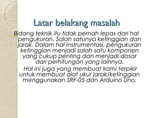 Alat pengukur dan pengontrol tingkat air menggunakan sensor ultrasonik dan Arduino Uno dibuat untuk mengukur jarak antara sensor dengan permukaan air dan mengontrol pompa air berdasarkan dua set point jarak yang ditentukan untuk mengisi dan menghentikan pompa secara otomatis. Alat ini bekerja dengan mengkonversi sinyal dari sensor ultrasonik menjadi tegangan melalui Arduino untuk menggerakkan relay yang terhubung dengan pompa.
