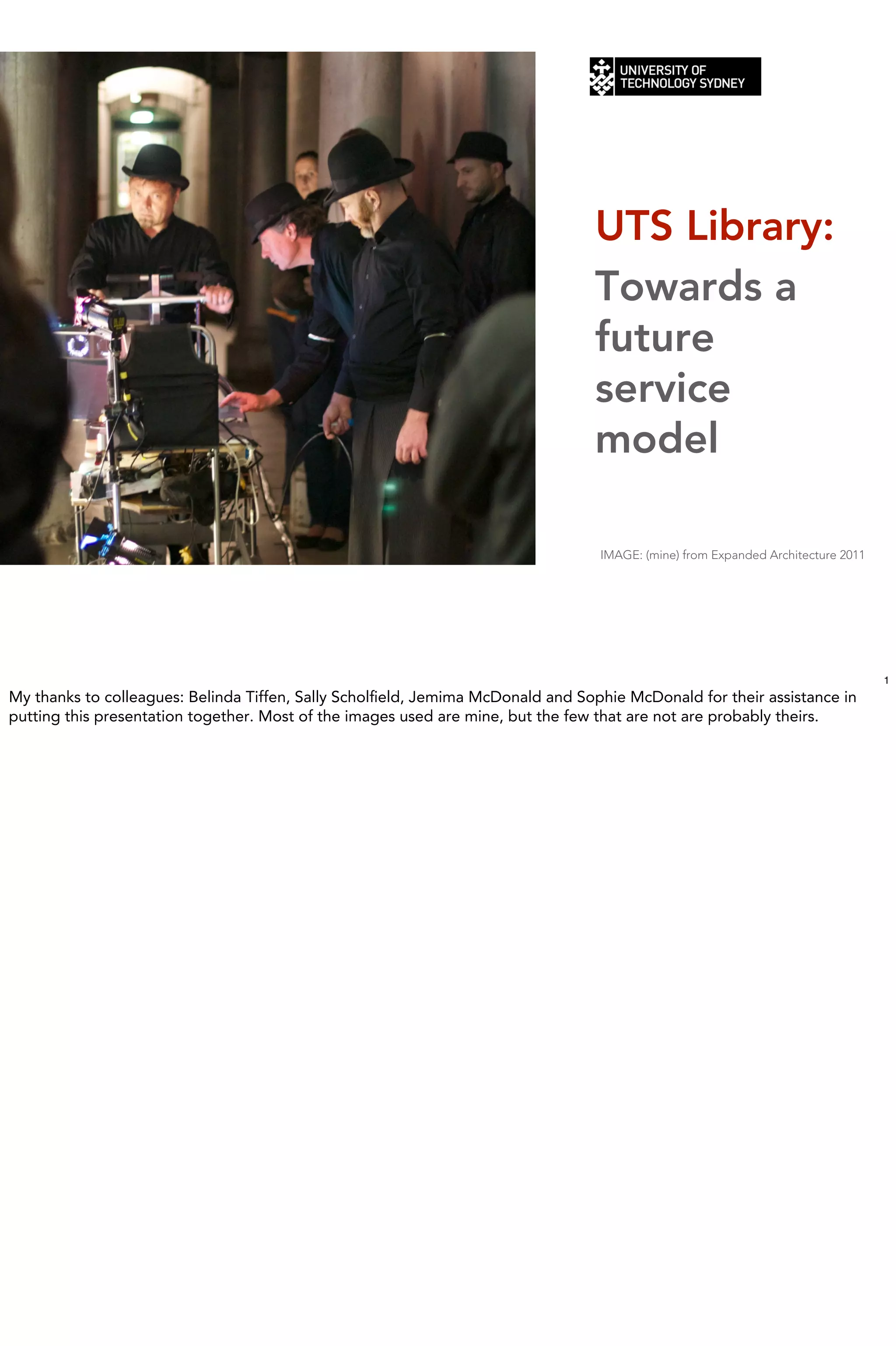 The UTS Library is exploring new service models to better meet the needs of students in the future. This includes relocating most of the physical collection to an underground retrieval system to free up space. New services will focus on improved search and discovery, cultural and learning hubs, customizable spaces, and 24/7 operations. Engagement initiatives like Fun Day have been successful in attracting hundreds of students through interactive activities and competitions.