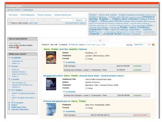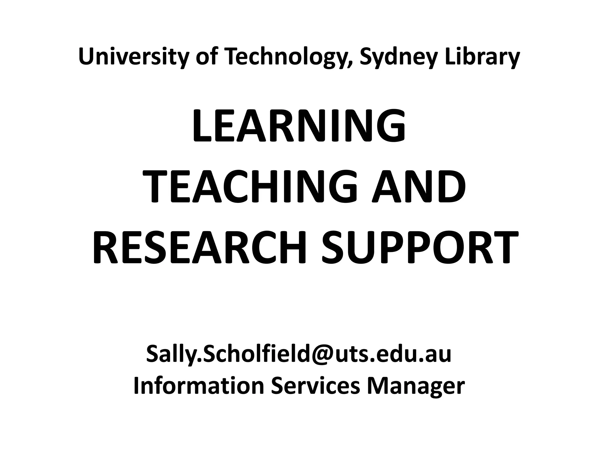 The document provides an overview of services and resources available at the University of Technology Sydney (UTS) Library. It discusses initiatives to support student learning and engagement, including orientation activities, skills workshops, and programs to promote reading. It also outlines the library's collections, technologies, and services to support teaching, learning, and research, such as resources for finding information, developing research skills, and getting assistance. The library aims to connect with students through mobile services, social media, and events like competitions and food for fines programs.