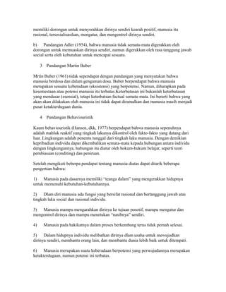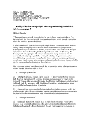 Dokumen membahas hakikat manusia dari berbagai perspektif psikologi dan pendidikan, menekankan kemampuan manusia untuk berkembang secara individual dan sosial. Selain itu, dijelaskan pula pentingnya pendidikan yang terencana dan berlandaskan nilai-nilai filosofis, sosiologis, dan normatif untuk menciptakan manusia yang utuh. Akhirnya, penekanan pada pengembangan dimensi kemanusiaan yang seimbang menjadi kunci untuk mencapai potensi maksimal dalam kehidupan.