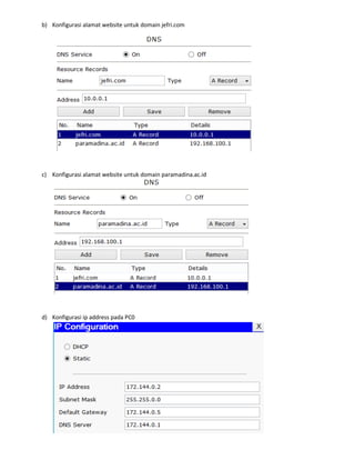 Dokumen ini berisi instruksi untuk mendesain jaringan dengan 1 router, 3 switch, 3 PC dan 3 server menggunakan Packet Tracer. Termasuk konfigurasi alamat IP, website, dan pengujian konektivitas antar node dan fungsi webserver dan DNS server.