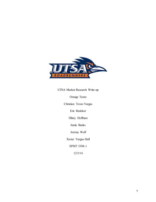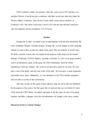 1. The document summarizes a market research project conducted by a group for the UTSA football program. The group surveyed fans at home games to understand the fan base and identify opportunities to increase game attendance and sales.
