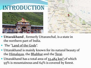 This document discusses the 2013 floods in Uttarakhand, India. It notes that heavy rainfall from June 14-17, 2013 caused devastating floods and landslides. The rainfall was over 375% of the benchmark amount. A cloudburst centered over Uttarakhand melted glaciers and caused rivers like the Mandakini to overflow. This natural disaster was exacerbated by man-made factors like deforestation, unchecked construction, and hydropower projects. The floods affected over 300,000 people across several districts, destroyed infrastructure and villages, and caused over 580 deaths. Kedarnath valley was among the worst hit areas.