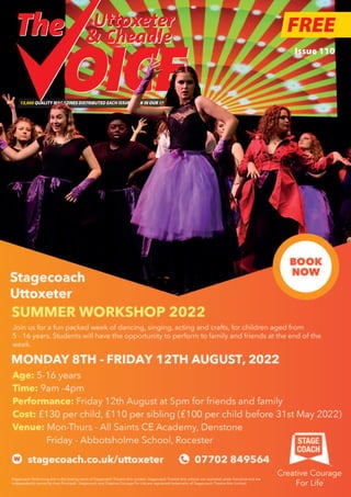 The Uttoxeter & Cheadle Voice magazine is a free publication distributed to 13,000 homes in the area. This issue includes articles about rising utility bills putting pressure on households, the Queen's Platinum Jubilee celebrations, and the return of the Uttoxeter Beer and Cider Festival now called "Party on the Pitch" with live music over two days in June. The Rotary Club funded new bat boxes to support bats in Bramshall Road Park. Advertisements announce various local businesses and services.