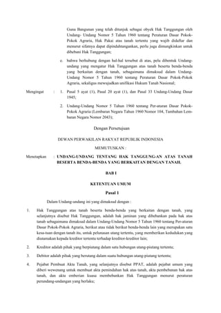 Undang-Undang Republik Indonesia Nomor 4 Tahun 1996 mengatur tentang hak tanggungan atas tanah dan benda-benda terkait, yang diperlukan untuk penjaminan utang dan meningkatkan kepastian hukum dalam kegiatan perekonomian. Dokumen ini menjelaskan ketentuan umum, objek hak tanggungan, serta prosedur pemberian, pendaftaran, dan penghapusan hak tanggungan yang bertujuan untuk memenuhi kebutuhan masyarakat dan mendukung pembangunan nasional. Secara keseluruhan, undang-undang ini diharapkan dapat memperkuat lembaga jaminan dan mendorong partisipasi masyarakat dalam pembangunan ekonomi.