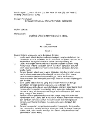 Undang-Undang No. 9 Tahun 1995 mengatur tentang pemberdayaan usaha kecil di Indonesia untuk mencapai pembangunan nasional yang adil dan makmur. Usaha kecil didefinisikan sebagai kegiatan ekonomi berskala kecil dengan kriteria tertentu, dan pemerintah bertanggung jawab dalam menciptakan iklim usaha yang mendukung pertumbuhannya. Tujuan utama dari undang-undang ini adalah untuk meningkatkan kemampuan usaha kecil menjadi mandiri, mengembangkan produk nasional, dan memperkuat struktur perekonomian nasional.
