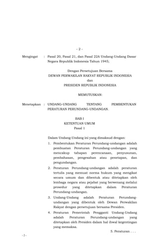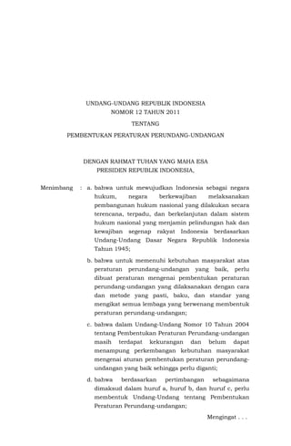Undang-undang Nomor 12 Tahun 2011 mengatur tentang pembentukan peraturan perundang-undangan di Indonesia. Undang-undang ini menetapkan asas-asas, jenis, hierarki, dan materi muatan peraturan perundang-undangan serta mekanisme perencanaan dan pembentukannya.