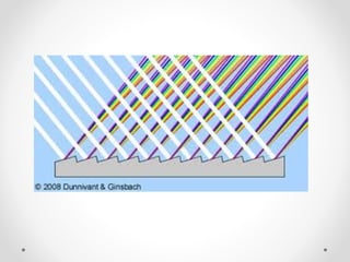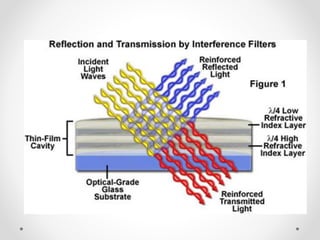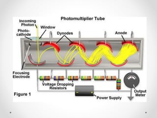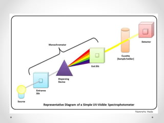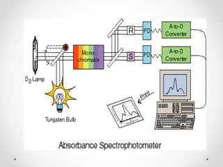 UV-visible spectrophotometers have five main components: a light source, filters or monochromator, sample compartment, detector, and recorder. Common light sources include tungsten lamps for the visible region and deuterium lamps for the UV region. Filters and monochromators are used to select the wavelength of light. Samples are placed in the sample compartment for analysis. Detectors such as photodiodes, photomultiplier tubes, or barrier layer cells convert light signals to electrical signals. The signals are then recorded to obtain a spectrum.