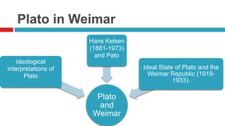 The document explores the connections between Plato's ideal state and the Weimar Republic, emphasizing the challenges faced in creating a perfect government. It highlights various interpretations of Plato's political thought by figures such as Werner Jaeger and Hans Kelsen, contrasting their views on the state and democracy in the historical context of post-World War I Germany. Ultimately, the document posits that both Plato's vision and the Weimar Republic were attempts to establish just political systems that ultimately faced insurmountable obstacles.