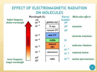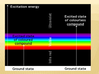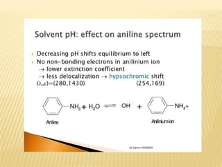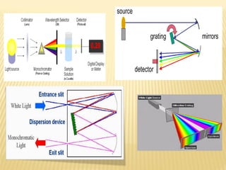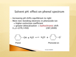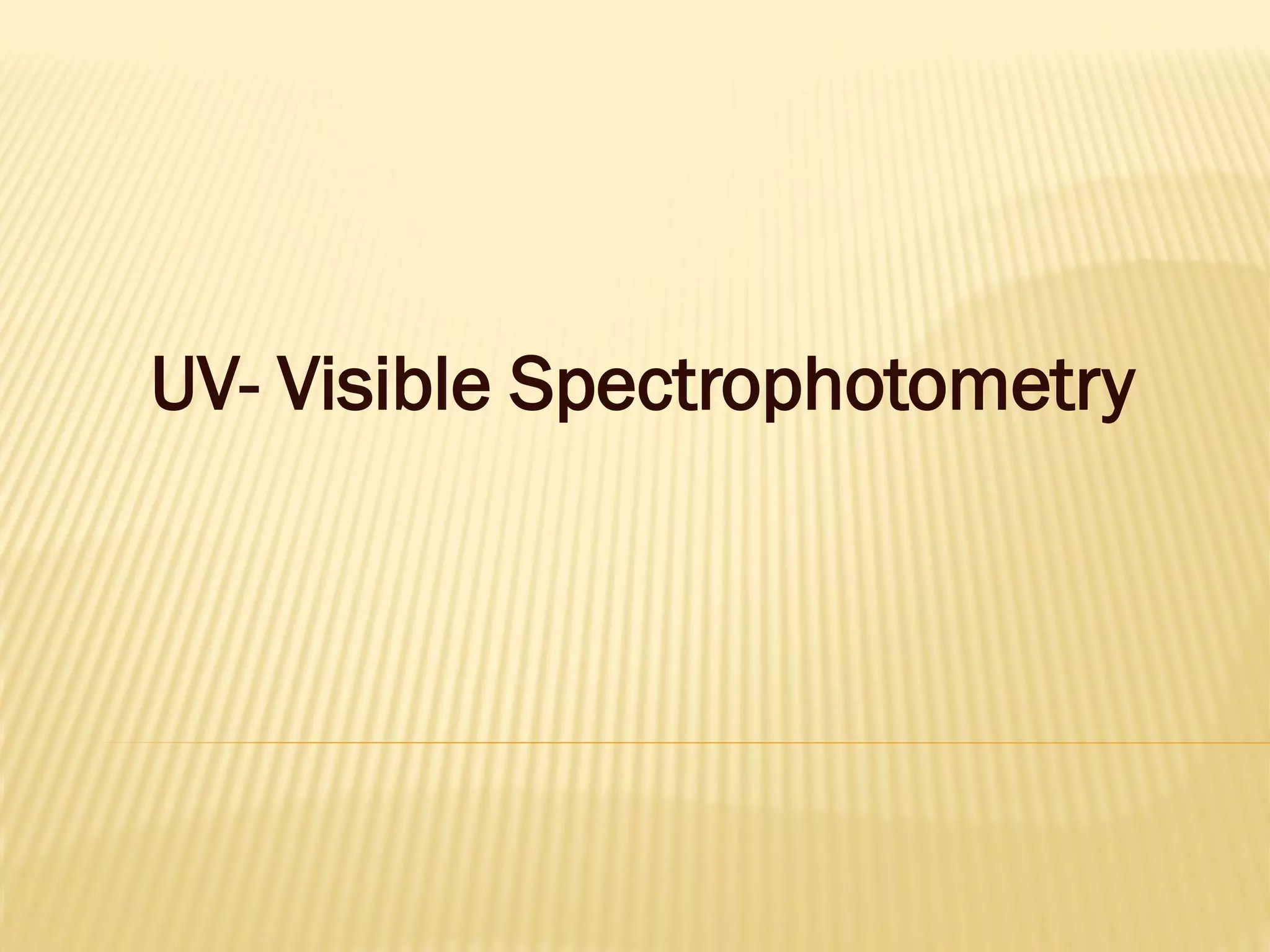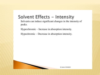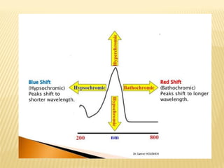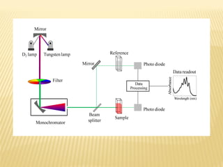 UV-Visible spectrophotometry involves measuring light intensity as a function of wavelength. A spectrophotometer directs light through a sample and measures the transmitted light intensities using a charged coupled device detector. It displays the results as a graph of absorbance versus wavelength. UV-Vis spectroscopy can be used to determine concentrations, detect impurities, elucidate organic structures, and study chemical kinetics by observing changes in absorbance.