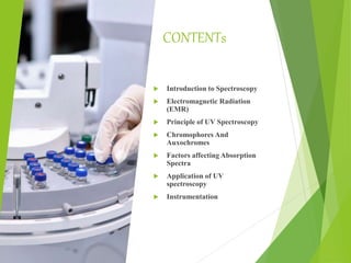 This document provides an overview of UV-visible spectroscopy. It discusses the electromagnetic spectrum and how UV-visible spectroscopy involves absorption of UV or visible light by molecules, promoting electrons to excited states. Beer-Lambert's law describes the relationship between light absorption and analyte concentration. Chromophores and auxochromes determine peak absorption wavelengths. Factors like pH and solvents affect absorption spectra. UV-visible spectroscopy has applications in determining molecular structures, concentrations, and impurities. Instrumentation includes sources like hydrogen lamps, monochromators, sample holders, detectors like photomultiplier tubes, and single or double beam spectrophotometers.